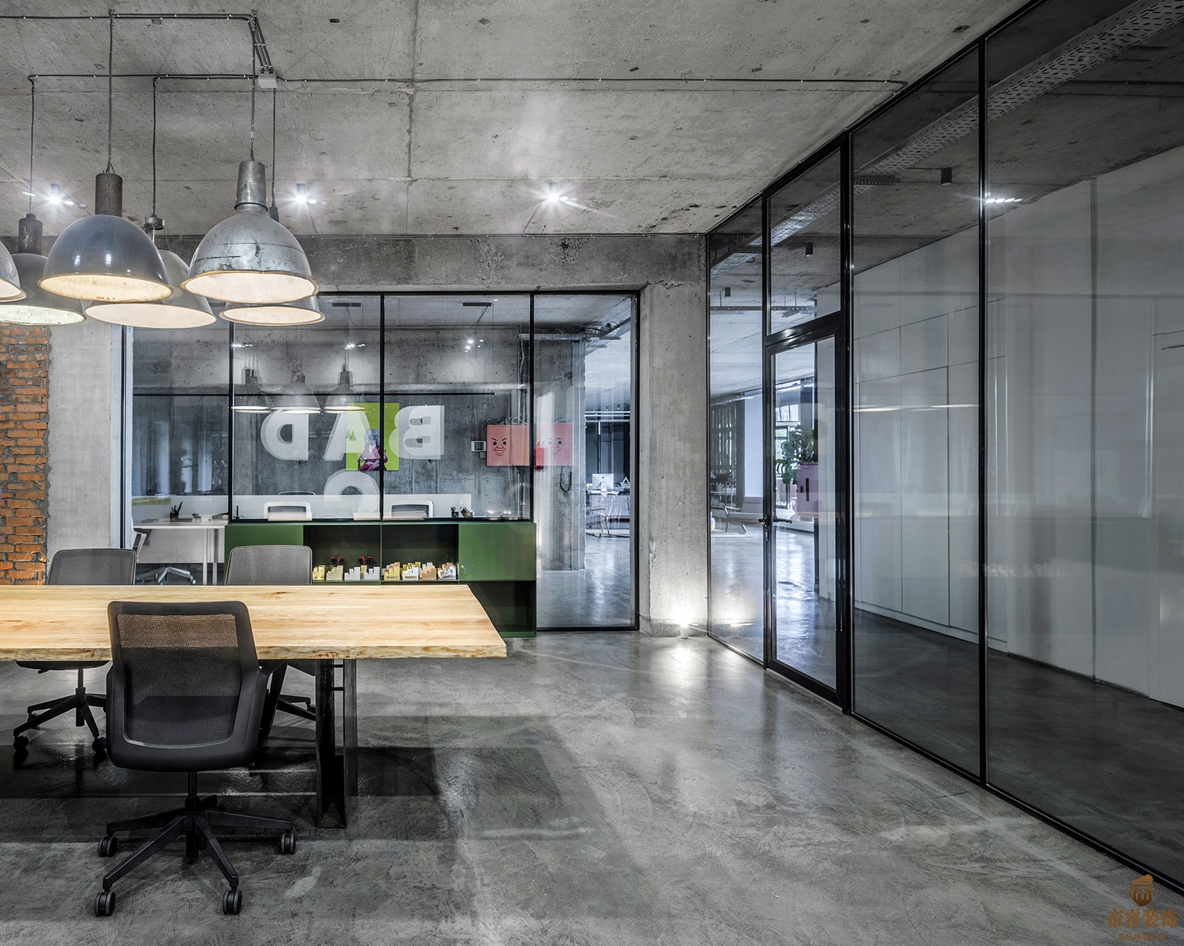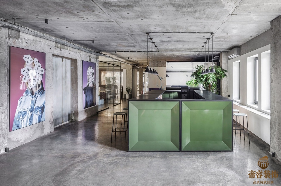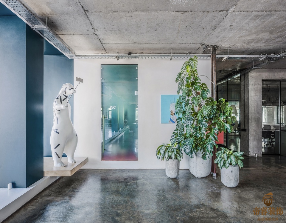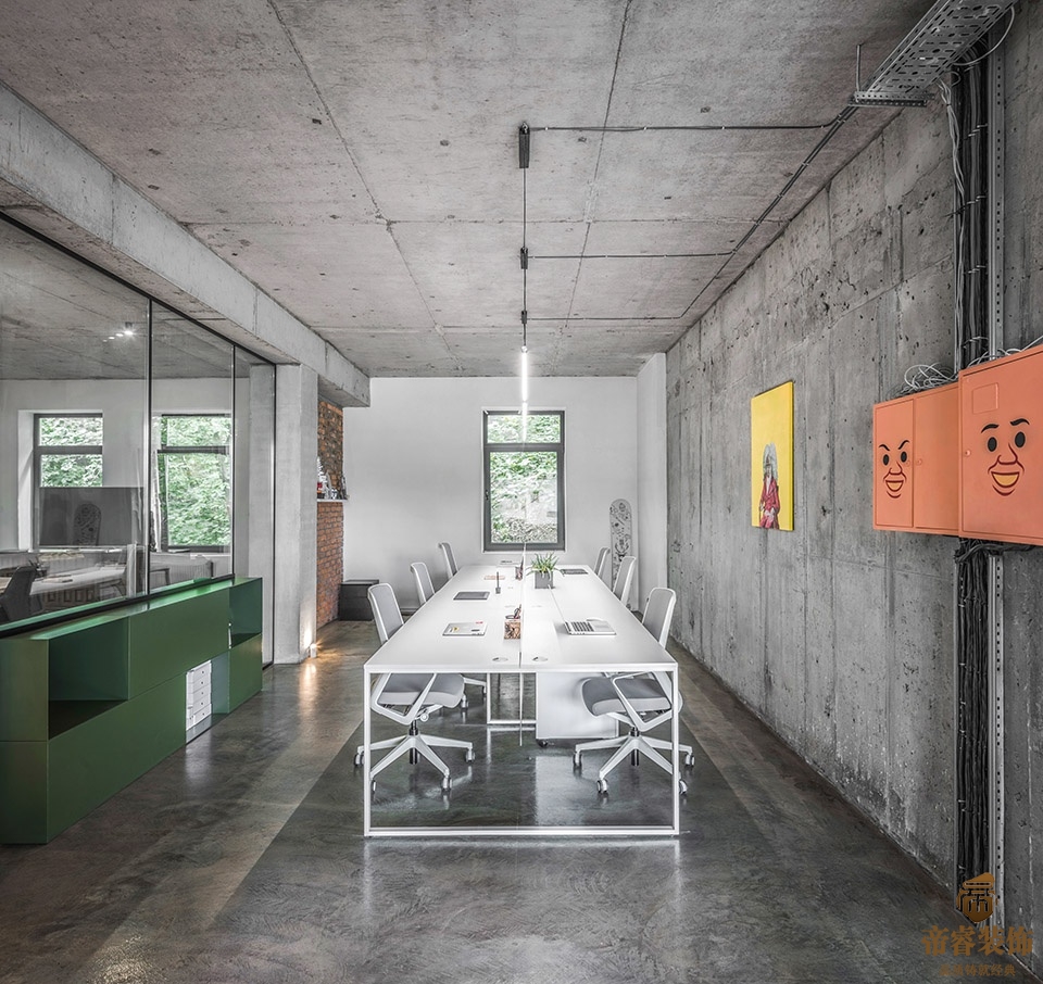 ▼工作空間內使用了充滿(mǎn)創(chuàng )意的裝飾畫(huà),用水泥墻面作為彩色裝飾畫(huà)的背景更具特色。